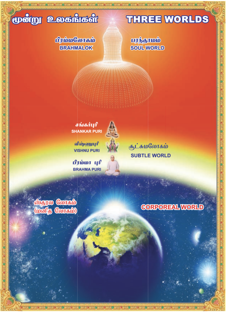 நாம் இருப்பது ஸ்தூல உலகம். இவ்வுலகில் தான் ஆத்மாக்கள் எலும்பு, சதையால் ஆன உடல் எடுத்து நாடகத்தில் நடிக்கின்றன. இன்ப துன்பத்தையும் அதன் பலனாக அனுபவிக்கின்றன. ஜனன மரணம் என்னும் சக்கரத்தில் வருகின்றன. இவ்வுலகில் எண்ணங்கள் எழுவதும், எண்ணங்களின் ஆதாரத்தில் கர்மங் களைச் செய்து இன்ப துன்பங்களை அனுபவிப்பதும் நடைபெறுகின்றன.