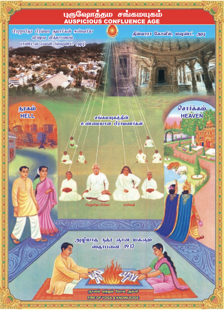 கலியுகத்தின் கடைசியும் சத்திய யுகத்தின் ஆரம்பமுமான சங்கமயுகத்தைப்பற்றி படத்தில் மரத்தின் அடியில் காட்டியிருக்கிறது. அங்கு வெள்ளை ஆடை அணிந்து பிரஜாபிதா பிரம்மா வும், ஜகதாம்பா சரஸ்வதியும் மற்ற சங்கமயுக பிராமணர்களும் சகஜராஜயோகம் செய்யும் தியானிக்கும்  நிலையில் அமர்ந்திருக்கிறார்கள். அஞ்ஞான இருள் சூழ்ந்த சமயத்தில் சிருஷ்டியின் மூல வித்தான பரமபிதா பரமாத்மாவும், ஞானக் கடலுமானவரான, சிவபெருமானுக்கு பவித்திர மானதொரு மனித சிருஷ்டியை உண்டாக்க வேண்டும் என்ற எண்ணம் காரணமாக காரணத்தால் பிரம்மா வின் சரீரத்தில் அவதாரம் செய்து அவருடைய கமலவாய் மூலமாக விலை மதிக்க  முடியாத கீதா ஞானத்தையும் சகஜ ராஜ யோகத்தையும் கற்பித்தார். அதன் படி நடந்த ஆண் – பெண்களுக்கு பவித்திரமான பிராமண பிராமணி களுக்கு சிவசக்திகள் என்று பெயர். இச்சிறிய யுகத்திற்கு லீப்யுகம் என்றும் புருஷோத்தமயுகம் என்றும் கீதா யுகம் என்றும் பெயர்.