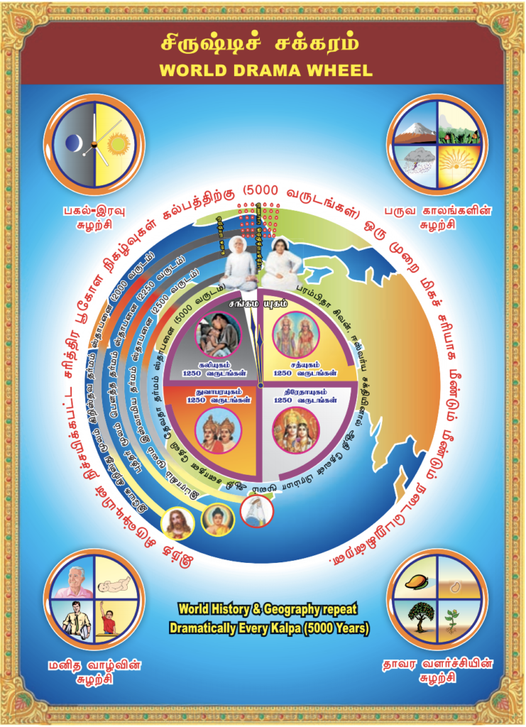 இயற்கையும் ஆத்மாவும் இணைந்து நடிக்கும் அனாதியான மனித சிருஷ்டியே ஒரு நாடகம் இதைத் தெரிந்து கொள்வதால் ஒரு ஜீவாத்மா வானது அளவுக்கப்பாற்பட்ட ஆனந்தமடையும். சுவஸ்திக் சின்னமானது சிருஷ்டி சக்கரத்தைச் சரியாக 4 சம பாகங்களாகப் பிரிக்கிறது. அவைகள் சத்தியயுகம், திரேதாயுகம், துவாபரயுகம், கலியுகமாகும்.