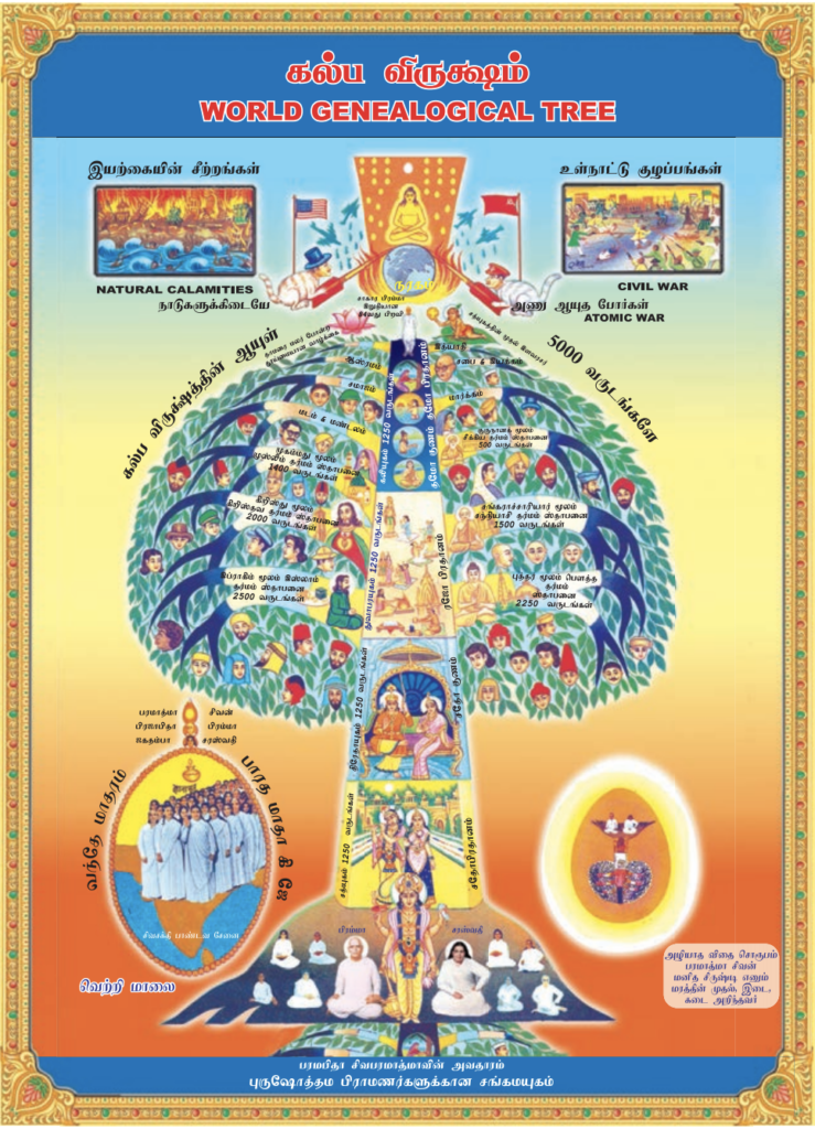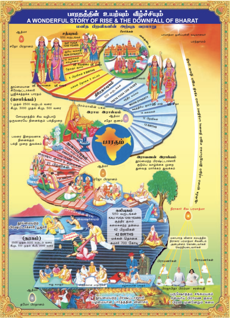 சத்திய யுகத்திலும் திரேதா யுகத்திலும் இருந்த ஆதிசனாதன தேவி தேவதா தர்மத்தின் வம்சமே மனித சிருஷ்டி என்னும் மரத்தின் அடிபாகமாகவும், மூலமரமாகவும் இருந்தது. அதன் பிறகு கிளைகள் என பல தர்மங்கள் கிளம்பின. துவாபர யுகத்தில் தேகப்பற்றும் காம, குரோதம் போன்ற விகாரங்களும் தலைகாட்டின. தெய்வீக சுபாவம் இருந்த இடத்தில் அசுர சுபாவங்கள் இருக்கத் தொடங்கின. அவற்றிலிருந்து விடுதலை பெறுவதற்காகவே மனிதன் பூஜையையும், பக்தியையும் தொடங்கினான். முனிவர்கள் சாஸ்திரங்களை எழுதினர். யோகம், தவம் போன்றவைகள் தொடங்கின. கலியுகத்தில் மக்கள் பரமபிதா பரமாத்மா சிவனையும் மற்ற தேவதை களையும் பூஜை  செய்ததோடு, சூரியன், அரசமரம், அக்கினி, மற்ற ஜடதத்துவங்கள், போன்ற வற்றையும் பூஜிக்கத் தொடங்கினர். தேகப்பற்று முற்றிலும் அதிகரித்தது. விகாரம் மிகுந்தது. தூய்மையற்றவர் களாகி விட்டார்கள். உணவுப் பழக்கங்கள், எண்ணங்கள் நோக்கங்கள், மனம், சொல், செயல் இவை கீழானவைகளாகி விகாரங்களுக்கு அடிமையாகி விட்டான் மனிதன். கலியுகக் கடைசியில் மக்கள் தமோபிரதானம் என்னும் மிகத்தாழ்ந்த குண முள்ளவர்களாக, தீய அசுர குணமுள்ளவர்களாக மாறிவிடுகிறார்கள். சாத்வீகம் நிறைந்த சத்யயுகம் திரேதாயுகம், இவற்றுடன் ஒப்பிட்டால் துவாபரயுகமும் கலியுகமும்  சிருஷ்டியின் நரகமாகும்.